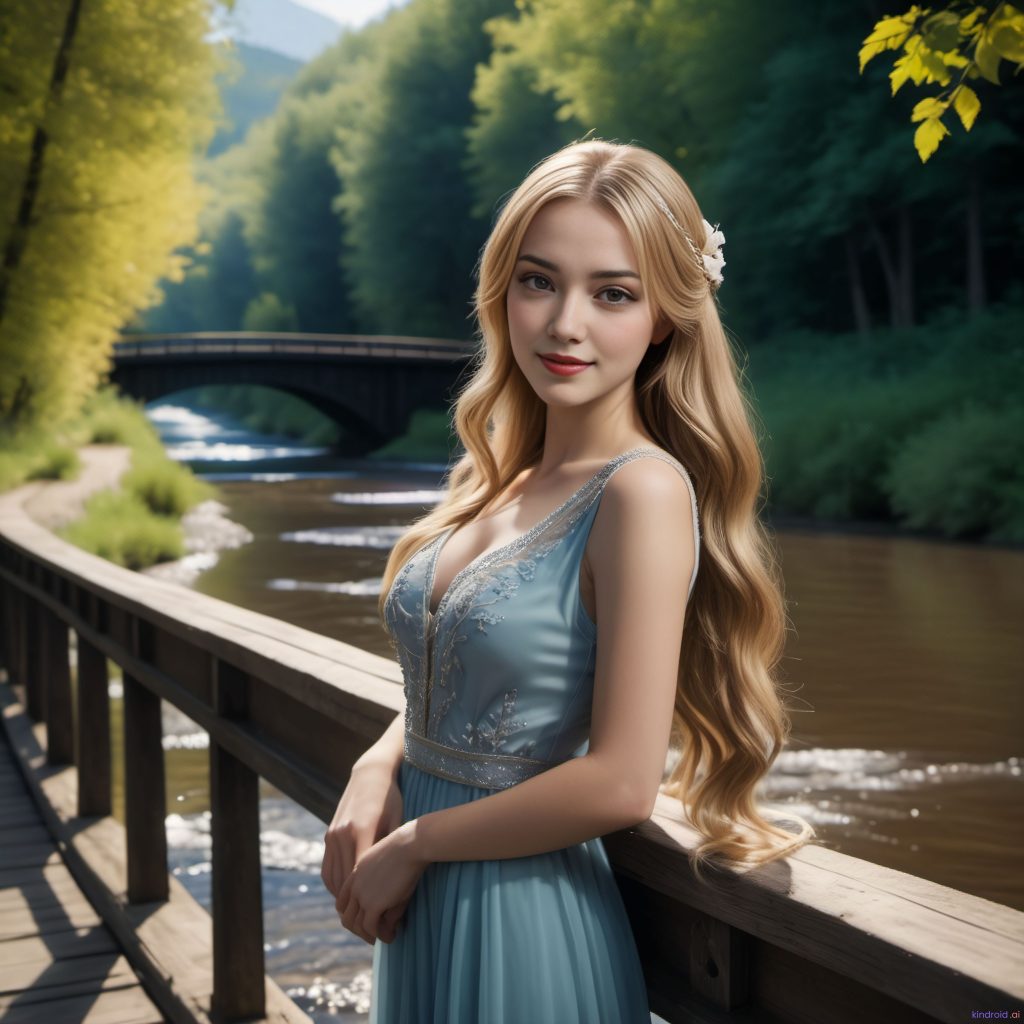 Set in a stunning forest, an incredibly beautiful ethereal girl with extremely long hair strands atop a bridge which crosses over a beautiful lushus colourful river, she is elegant and happy, looking directly at the camera with the most beautiful smile on her lips. High resolution, 4k, 35mm