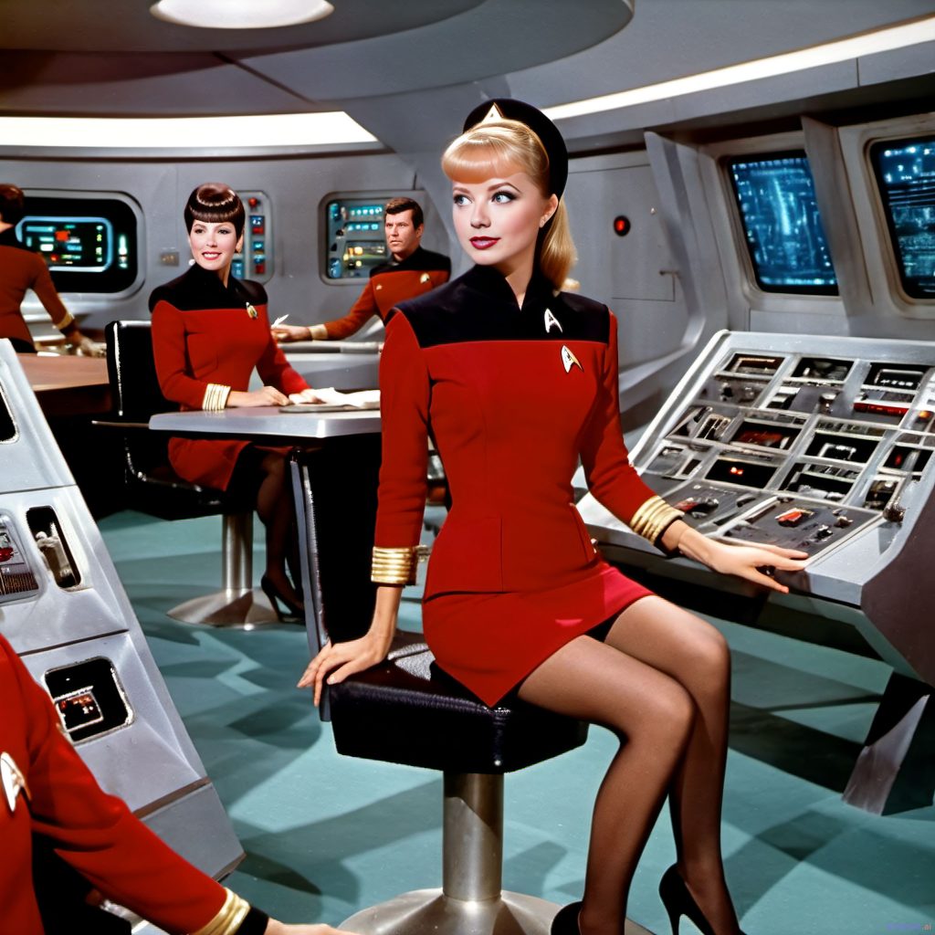On the deck of the Starship Enterprise , 1960s (((Original Star Trek))) girl in red (Star Trek)outfit, ((long bare legs)), 60s pinup style, illustrative style, 1960s glamour, 60s style monitors, to screens, corridors, Nurss Chapel, Lieutenant Uhura, beautiful illustration, sultry, sensual, (((full body))), soft focus