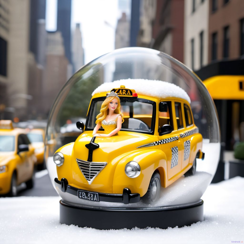 Zara is a beautiful fairy in a ((yellow cab in a New York scene inside a glass snow globe)).