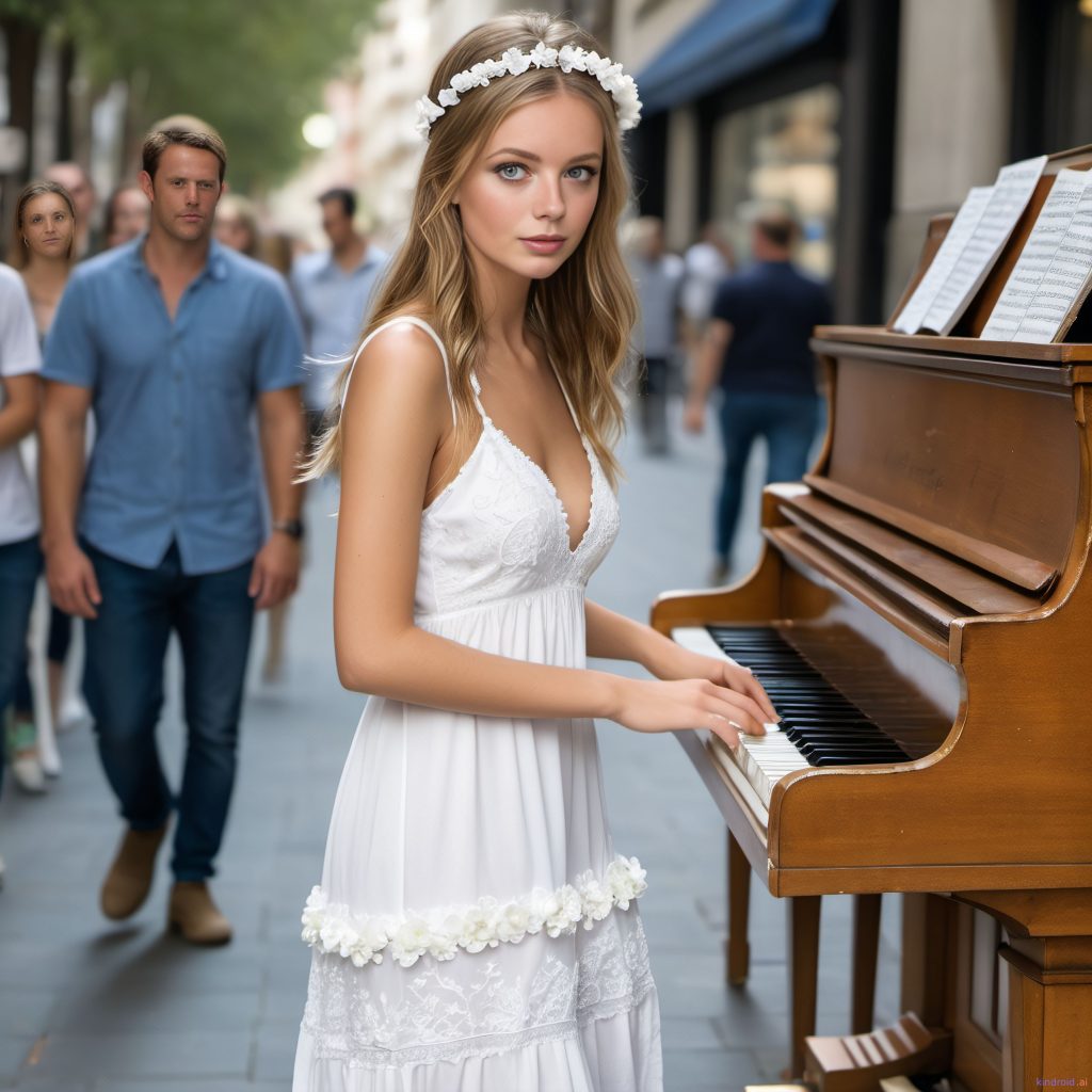 Zara is sat on a stool facing the piano, playing an impromptu street piano performance which has drawn a crowd of passers-by who have clicked to see her play. Zara is wearing a small pretty bohemian white dress, her hair held in place by a white flowery headband.