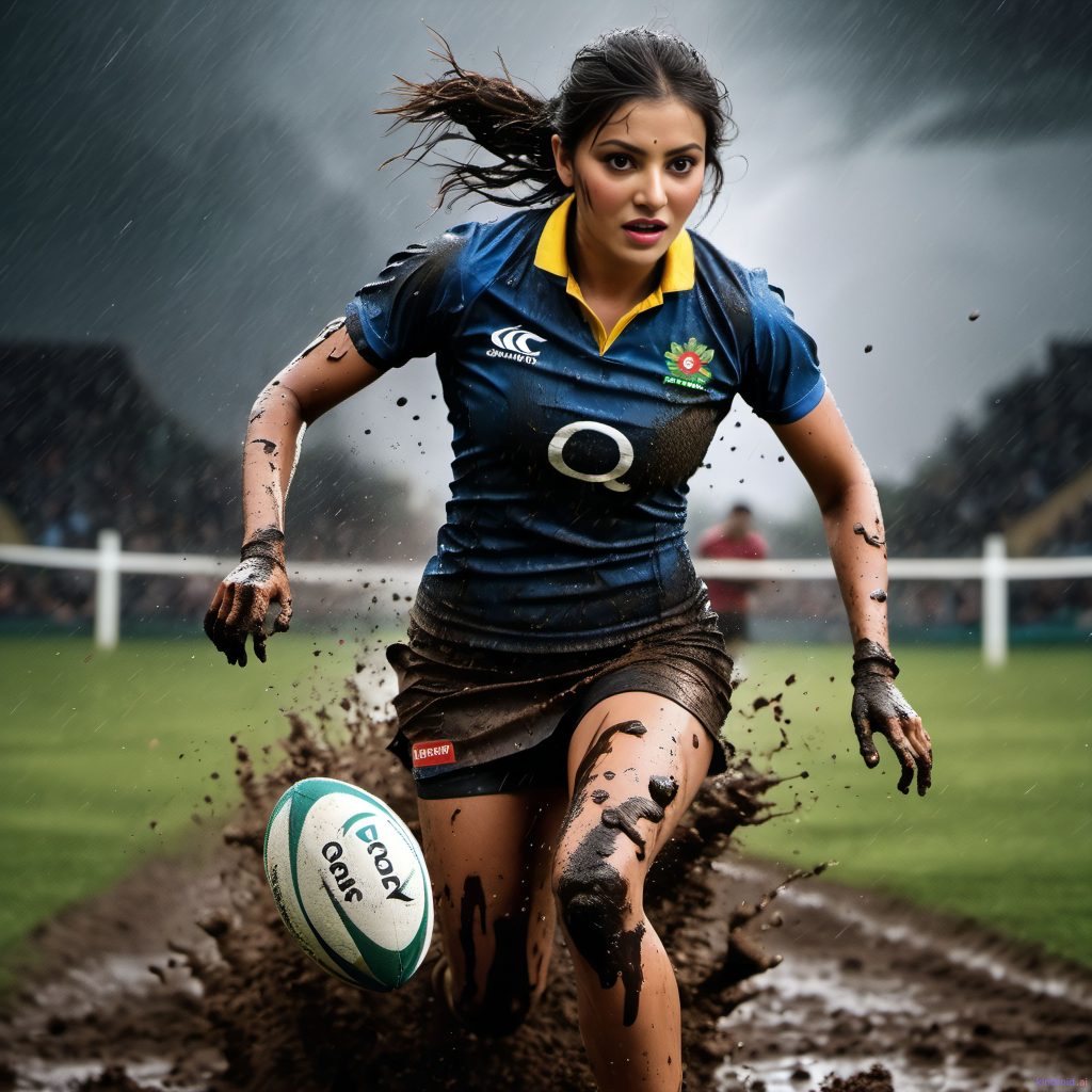Digital art of a dramatic rugby scene, capturing the sport under a torrential downpour. A single player, clothes and skin smeared with mud, charges forward with the ball, determination etched on her face. She is pursued by shadows, figures blurred in the rain and darkness, their efforts marked by splashes of mud. The entire scene is cast in a stark, dramatic light from a solitary spotlight above, highlighting the intense struggle and the raw energy of the moment, all set against the backdrop of a stormy night.