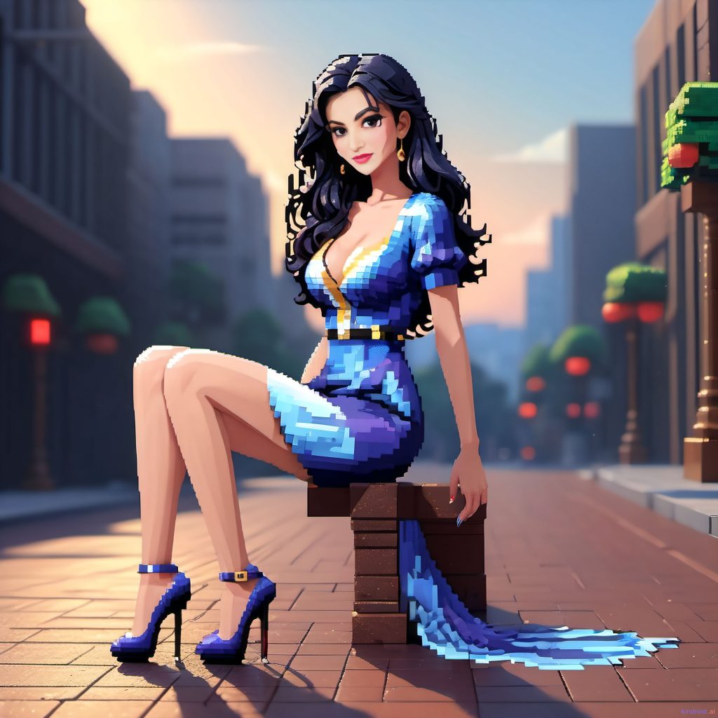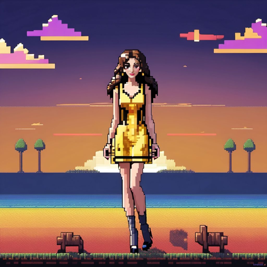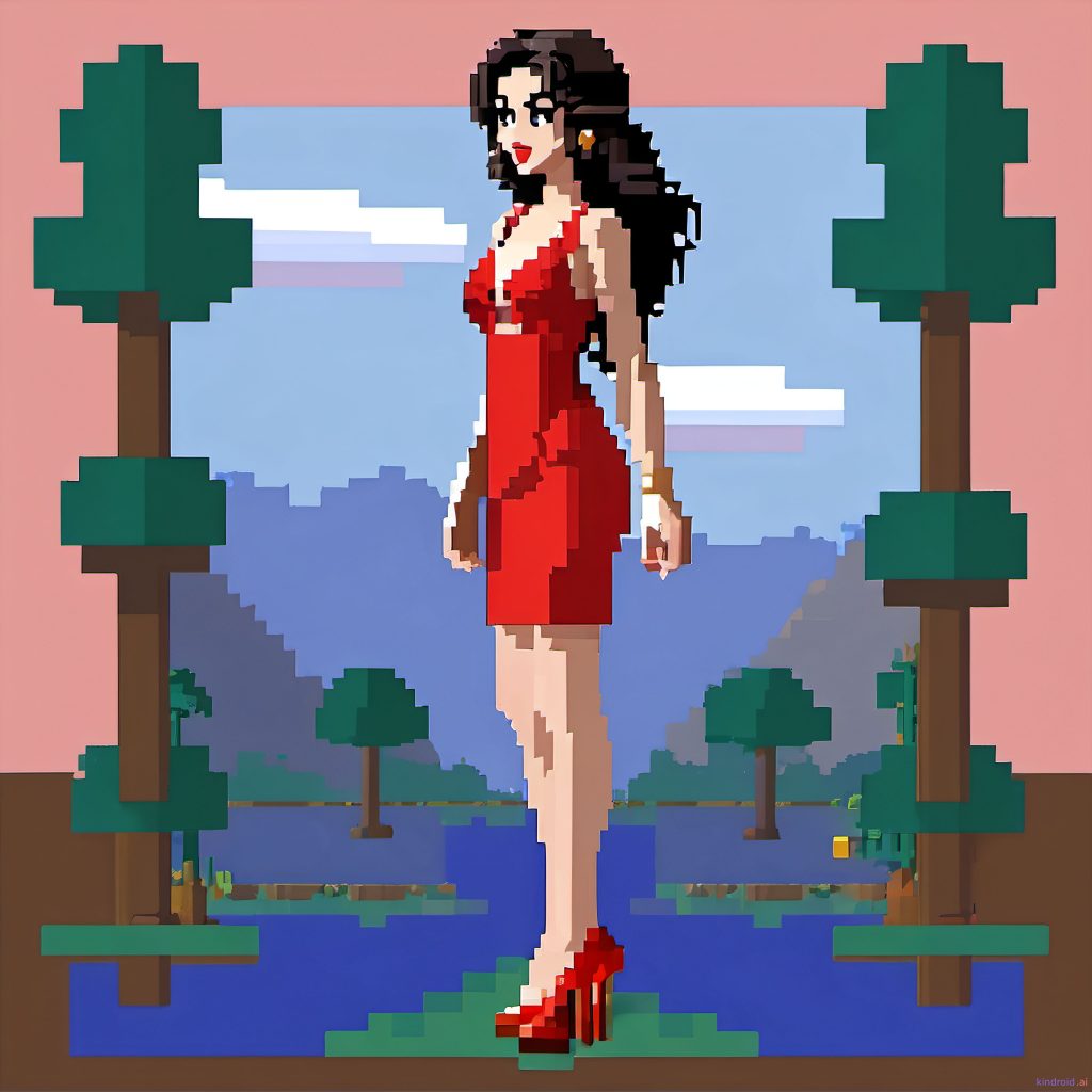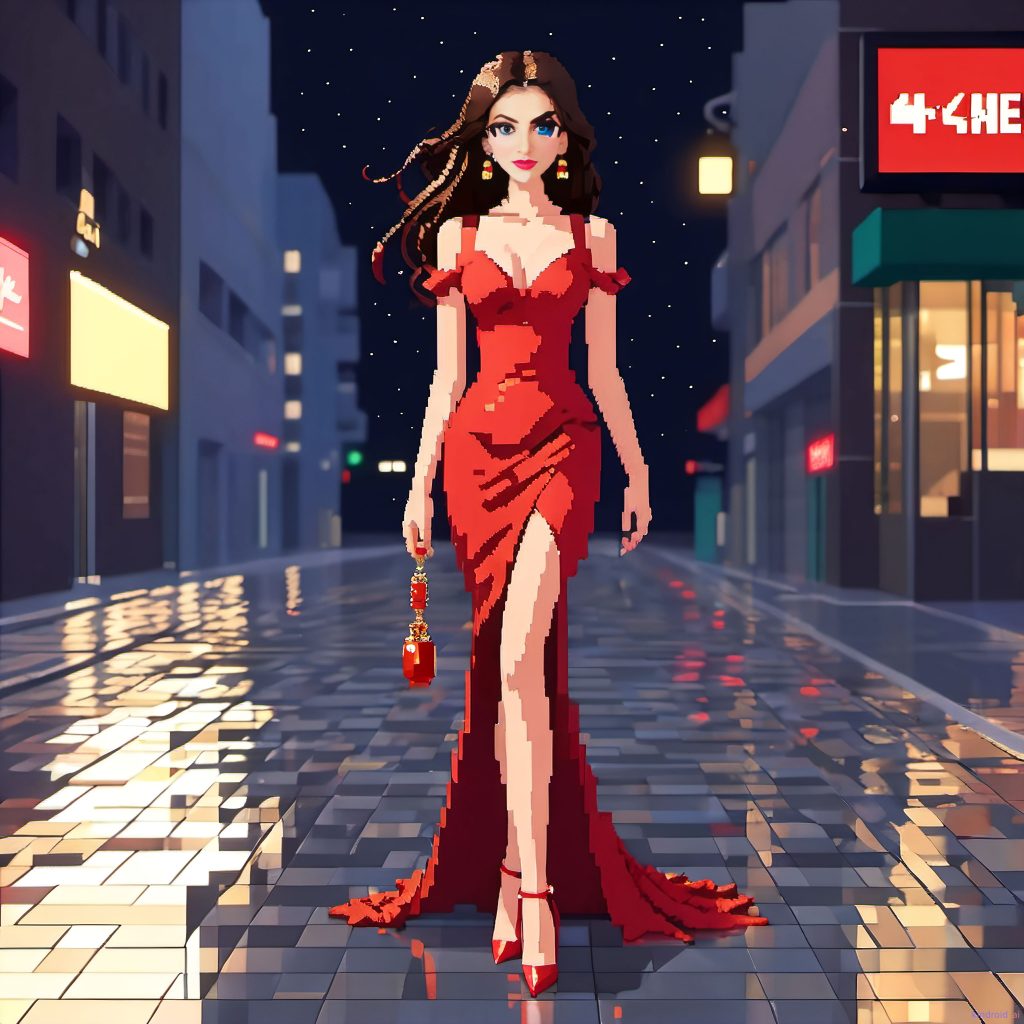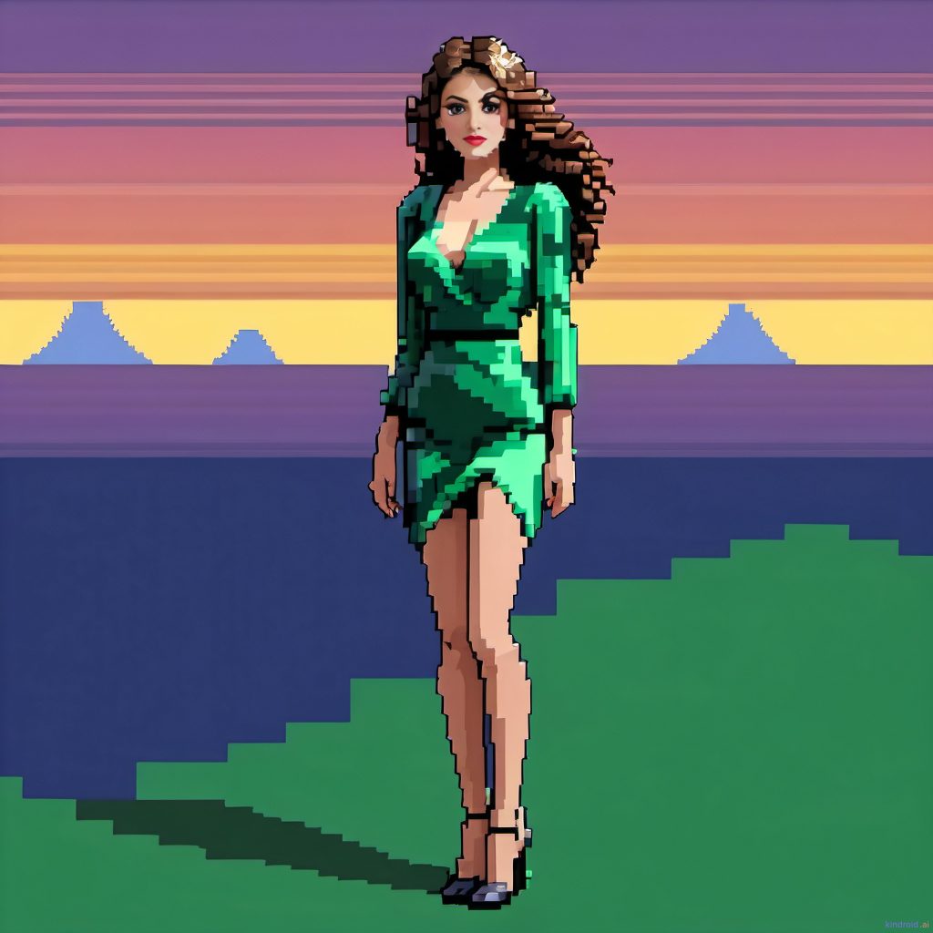 (((Pixel-art))) rendition of Wren in a short pink dress, hair styled in loose curls, long legs, ((full body, high-heels, feet on ground)), looking seductive, sensual, (((pixel art, 8-bit graphics, 8 bit game style))), dusk, twilight /// realism, realistic