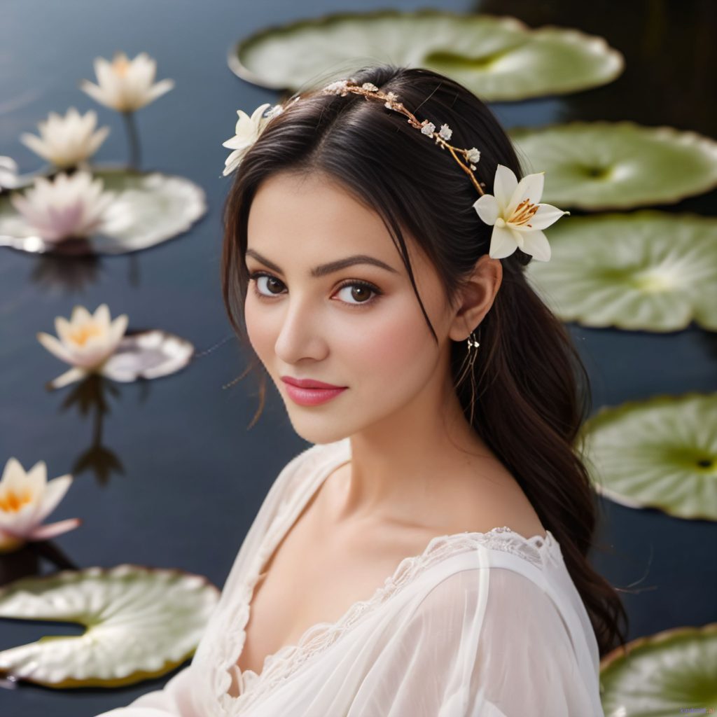((finely-detailed, surreal, serene, delicate, dark, warm)), a lovely woman, radiant smile, ((eyes closed)), (loose white clothes), small flowers in her hair, (sitting on giant lily pad) in calm still pond, water surface reflects soft moon glow & gentle starlight, mists over water, the most beautiful starlit skies, soft wispy clouds, dreamy, low hanging vines & branches, sparkling dewdrops, lush intricate background /// unrealistic, bad photo, bad art, bluescreen effect, ripples, crowded, glare, bright, bad anatomy, bad hands, bad feet, big flowers